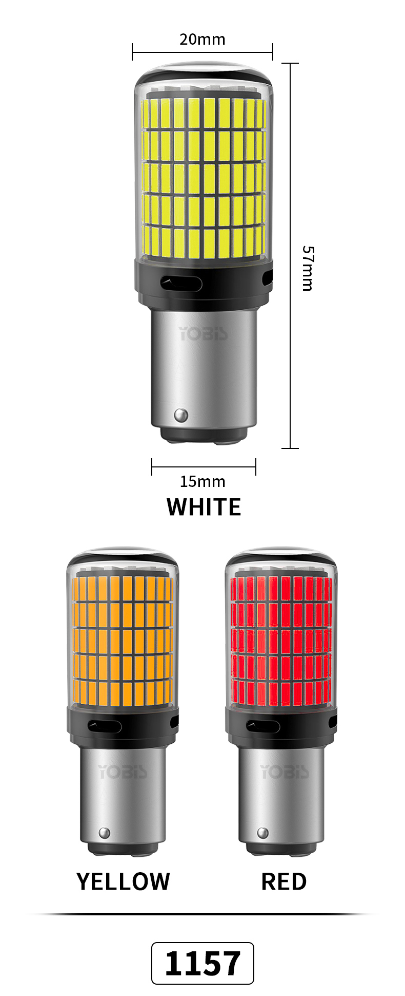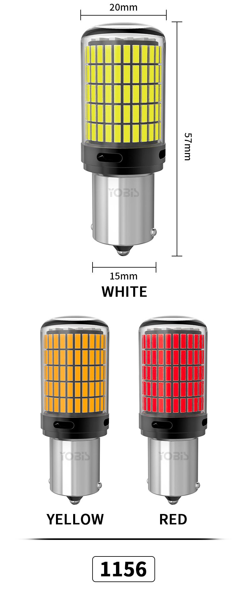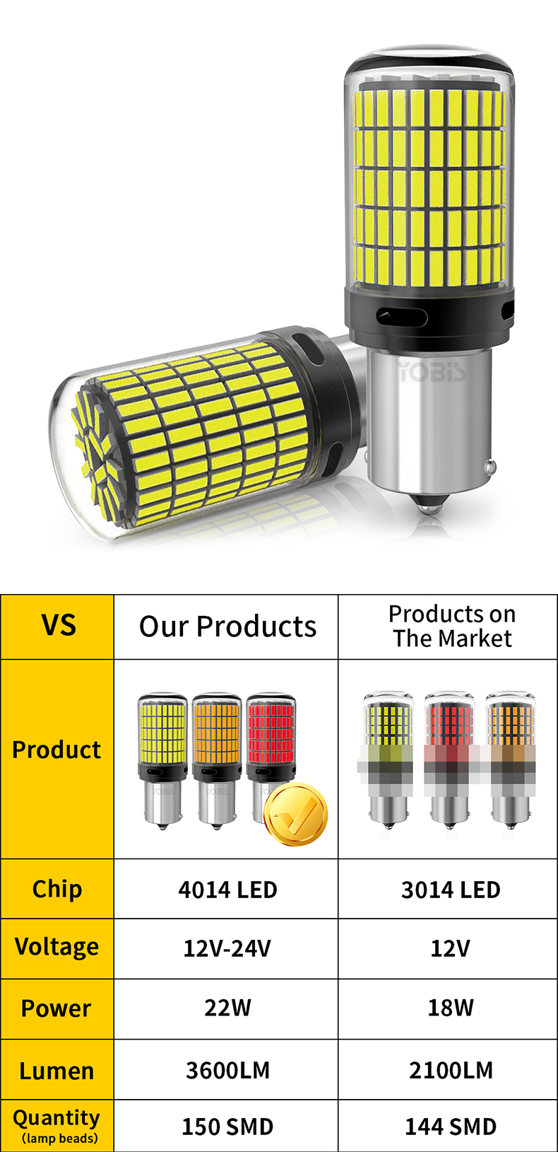 Present the key specifications--|--------------------------------| | Product Model | YOBIS ZX4014-150 | | Power | 22W per per bulb | | Voltage | DC 12-36V (operates 9V-15V for 12V cars) | | Current | 1.83A Chip Type | 4014 Chip | | Available Colors | White, Yellow, Red | | CANBUS | Yes (built-in load resistors) | | Warranty | 2 Years | | MOQ | 10 pcs |